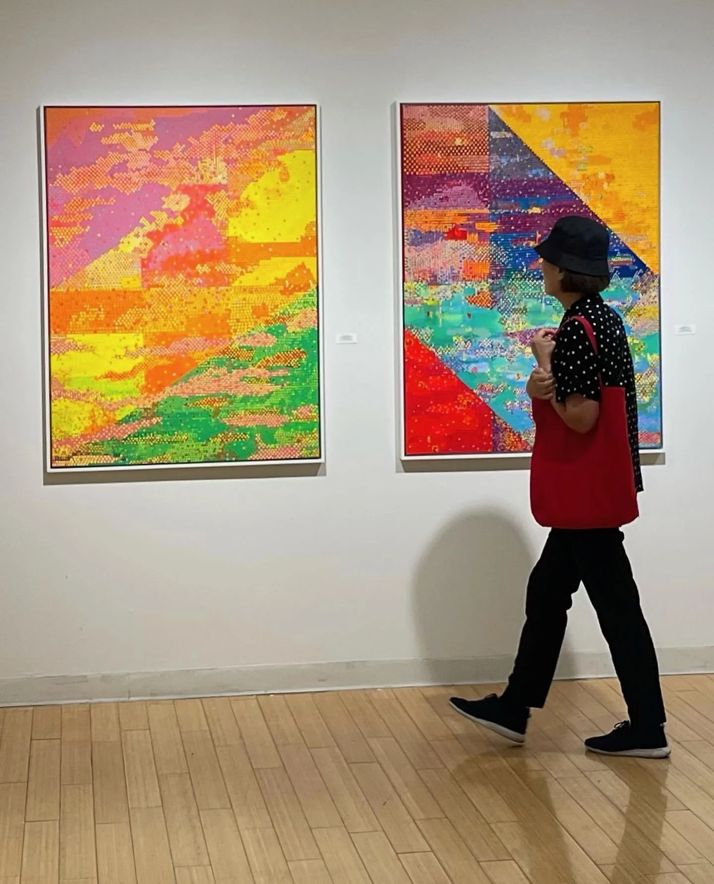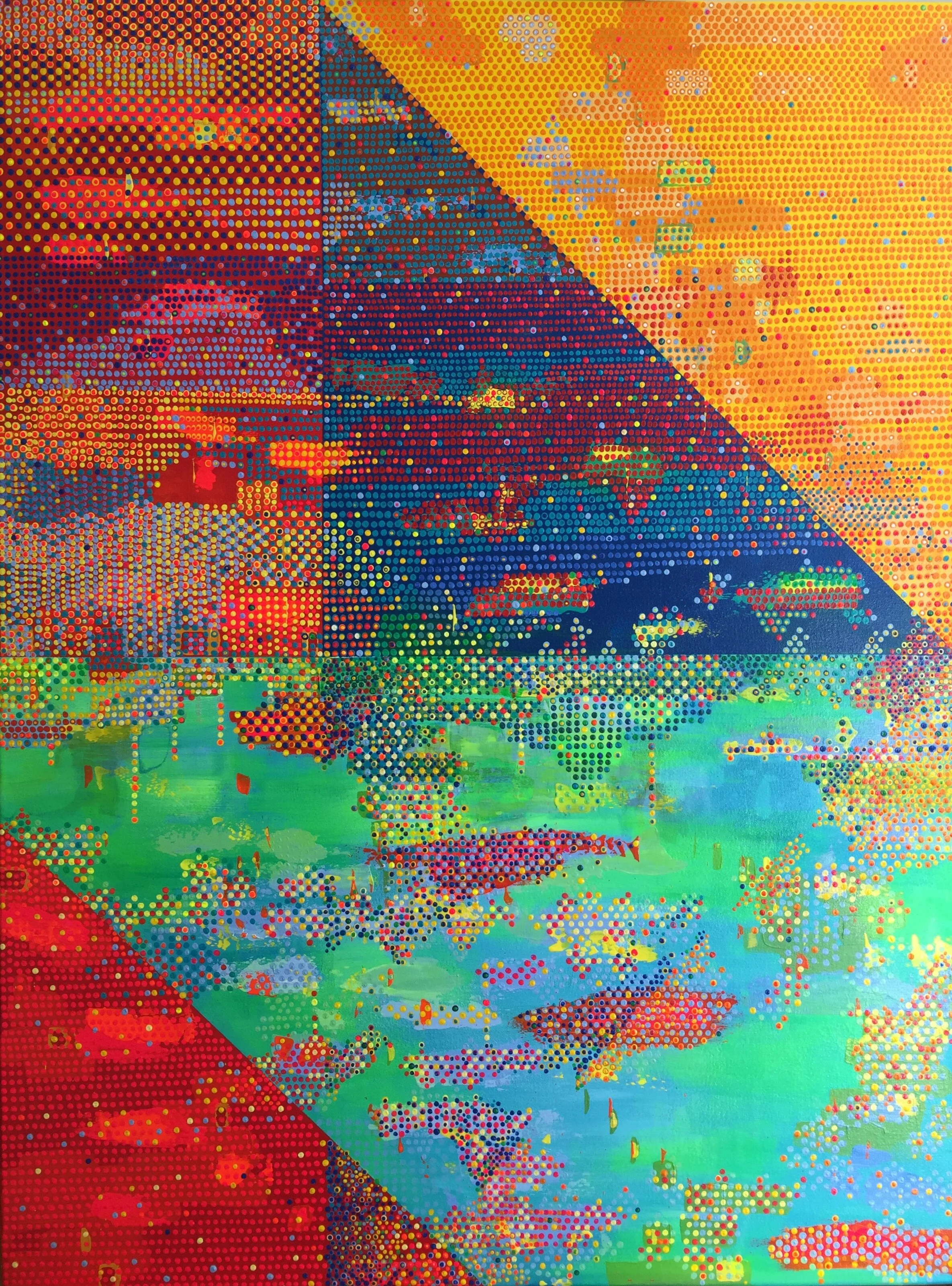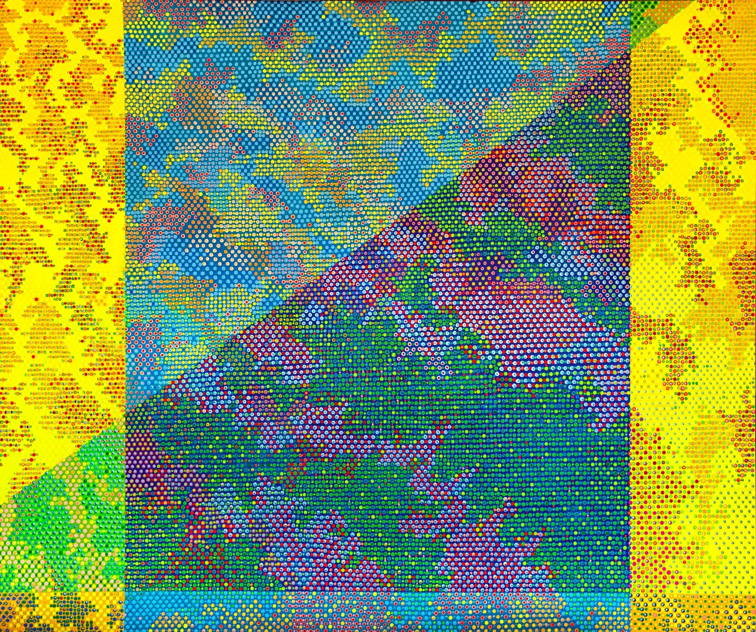 This series references a dynamic relationship primarily through the juxtaposition of dense color layers within an abstract geometric structure. The color layers form cloud-like patterns of light, which flow through and across the geometric boundaries of the surface to communicate the ephemeral interplay of light and the tangible structure of the physical world. Richly textured patterns of color simultaneously define and erode the geometric boundaries within the paintings.